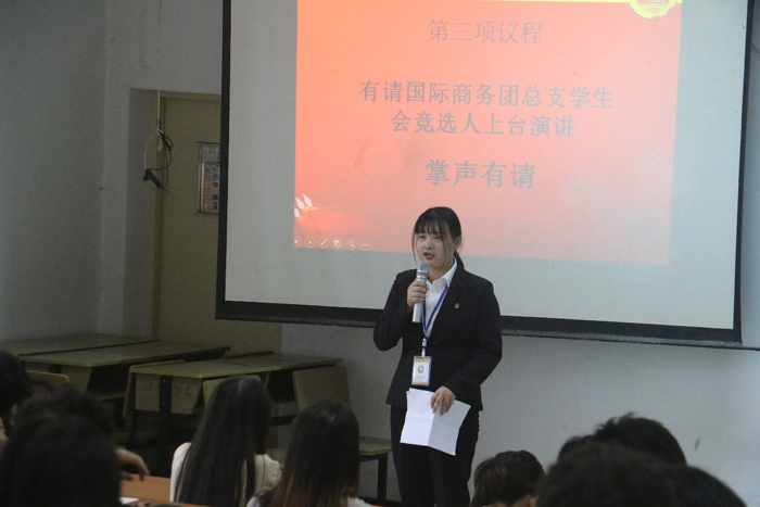 9月23日下午,国际商务学院团总支第二届换届大会在3201教室举行,校团委书记司斌斌书记,校团委周莹老师,国际商务学院党支部书记汪慧书记,国际商务学院学工助理黄吉胜老师、辅导员吕欣欣老师及各分院学生会,大学生记者团,校卫队,社团联合会以及国际商务学院各班级同学参加了此次大会。