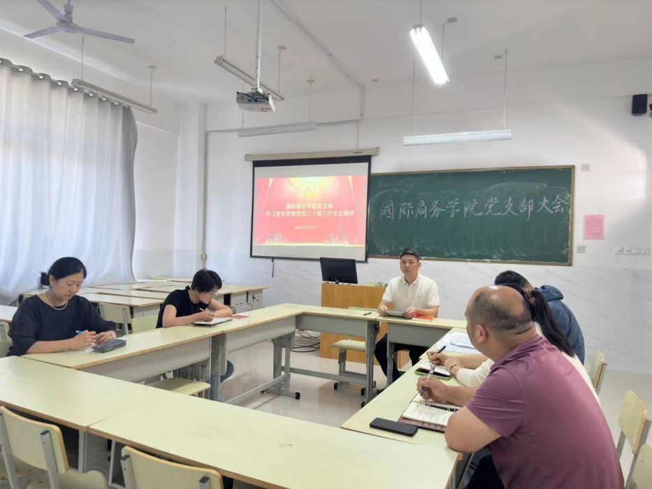 9月23日下午,国际商务学院党支部召开专题学习会议,传达学习贯彻党的二十届三中全会精神宣讲会的通知。会议期间,与同志们集体学习全会精神,并交流学习心得体会。