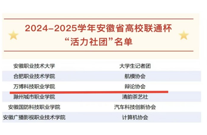 2025年11月7日,团安徽省委、安徽学联开展2024-2025学年安徽省高校联通杯“活力社团”风采展示活动汇报评审。我校辩论协会与青年志愿者协会凭借扎实的活动积淀、鲜明的品牌特色与广泛的影响力成功入围,代表学校亮相省级舞台,尽显新时代高校社团的青春担当。尤为可喜的是,辩论协会凭借卓越表现,荣获2024-2025学年安徽省高校联通杯“活力社团”称号!
