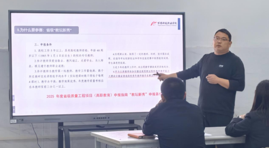 4月15日,万博科技职业学院召开2026年教育教学技能竞赛交流会。会议围绕省级教学竞赛政策解读、备赛要点及最新赛项变化展开,旨在提升教师参赛水平,推动“以赛促教”落地见效。质量监控办公室副主任关松涛主持会议并作专题培训,交通工程学院院长张静、智能信息学院院长陈照强、智能信息学院副院长黄昱馨等出席会议,全体参与校级教学技能竞赛的教师参会学习与交流。